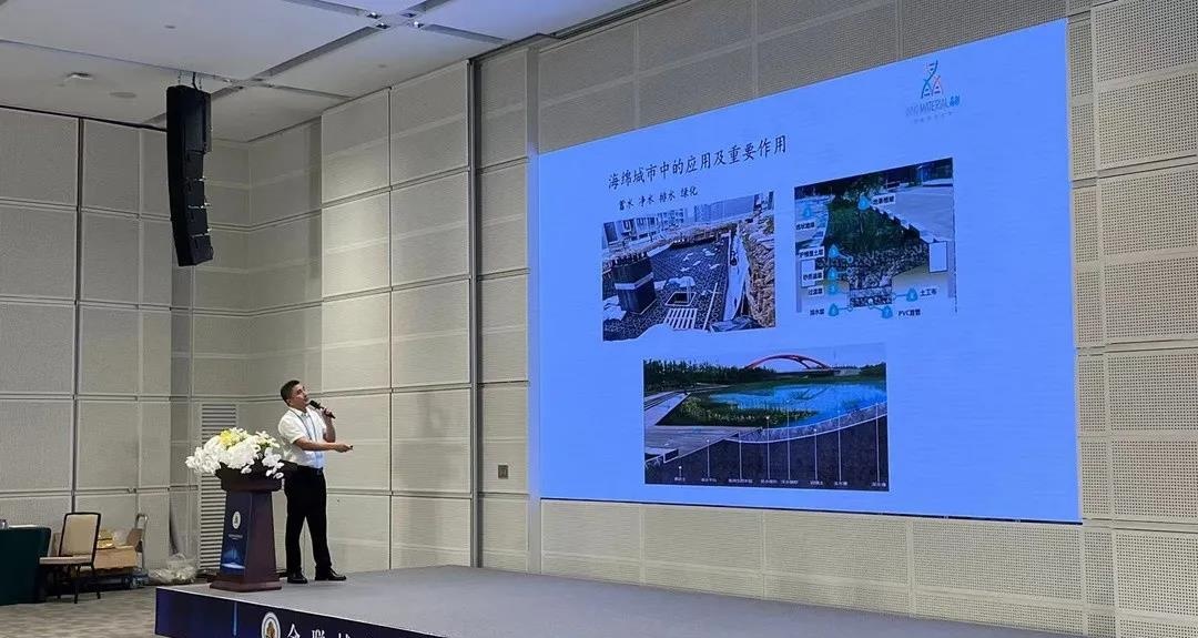 晶創新材料董事長馮忠超誠邀參加此次會議,就新型土工布在海綿城市工程中的應用及重要作用做出詳細講解,馮總表示:在新興的海綿城市建設中,聚丙烯長絲土工布發揮持久耐腐蝕、高效反濾、加筋等功能,能適應凹凸不平的基層,能抵抗施工外力破壞,蠕變小,長期荷載下仍能保持原有的功能 ;針對“蓄、凈”措施,聚丙烯長絲土工布能夠發揮蓄水、凈水的功能,保證上層結構的泥沙有效留存,凈化水質,能有效存儲、過濾雨水。有良好的水力條件和反濾條件,保證不易淤堵,從而達到雨水綜合利用的目標。聚丙烯長絲土工布在海綿城市中使用年限超過工程設計壽命,提高工程質量,耐腐蝕、抗老化、不易降解,對環境起到保護作用,更經濟、有效、持久解決了工程建設中的基本問題,符合國家高質量發展、綠色發展戰略!促進海綿城市可持續發展。