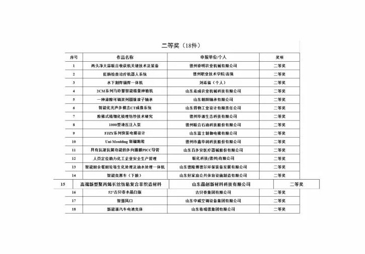 2021年11月24日,德州市人民政府公示了 德州市首屆“市長杯”工業(yè)設(shè)計大賽獲獎名單,山東晶創(chuàng)新材料科技有限公司榮獲二等獎,作品為“高端新型聚丙烯長絲紡粘復合非織造材料”。