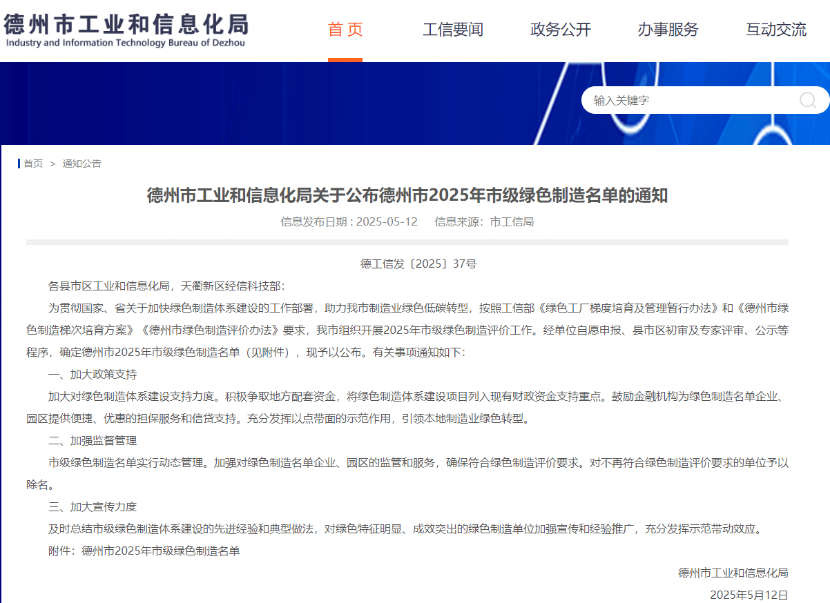 5月12日,德州市工業和信息化局通過官網發布了德州市2025年市級綠色制造名單,榜單中包括41家綠色工廠和4家綠色供應鏈管理企業,山東晶創新材料科技有限公司憑借在綠色發展領域的卓越表現,成功入選“德州市市級綠色工廠”,這一榮譽不僅是對晶創公司綠色制造實踐的高度認可,也標志著其在推動土工合成材料產業綠色轉型、助力實現“雙碳”目標的征程中邁出堅實的一步。